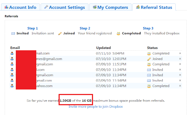 Dropbox has a plan for inviting friends and in exchange you can receive up to 16 GB additional free storage space. Right now, you can see I've earned 1.50GB of the maximum 16GB. Notice I've blocked out the full e-mail addresses of the friends I've invited to join Dropbox using the referral system in this screen shot of my account below: