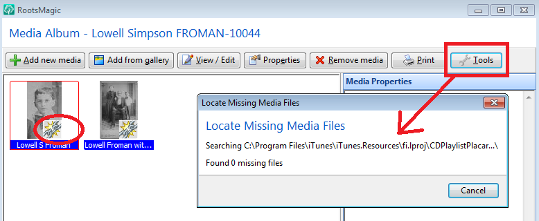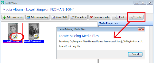 How did Ol' Myrt fix those broken media links in her RootsMagic database? Well, Bruce Buzbee explained during the webinar that when viewing the "Media Album" for an ancestor, one merely clicks TOOLS and then selects FIX BROKEN MEDIA LINKS as shown below: