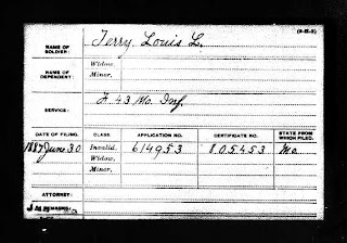 ABOVE: Louis L. Terry pension card index. National Archives and Records Administration. Civil War Pension Index: General Index to Pension Files, 1861-1934 [database on-line]. Provo, UT, USA: Ancestry.com Operations Inc, 2000. Original data: General Index to Pension Files, 1861-1934. Washington, D.C.: National Archives and Records Administration. T288, 546 rolls. The image is found here at Ancestry.com. From the NARA website we find the following description "The pension applications to which this index applies relate chiefly to Army, Navy, and Marine Corps service performed between 1861 and 1916. Most of the records relate to Civil War service; some relate to earlier service by Civil War veterans; others relate to service in the Spanish-American War, the Philippine Insurrection, the Boxer Rebellion, and the Regular Establishment."