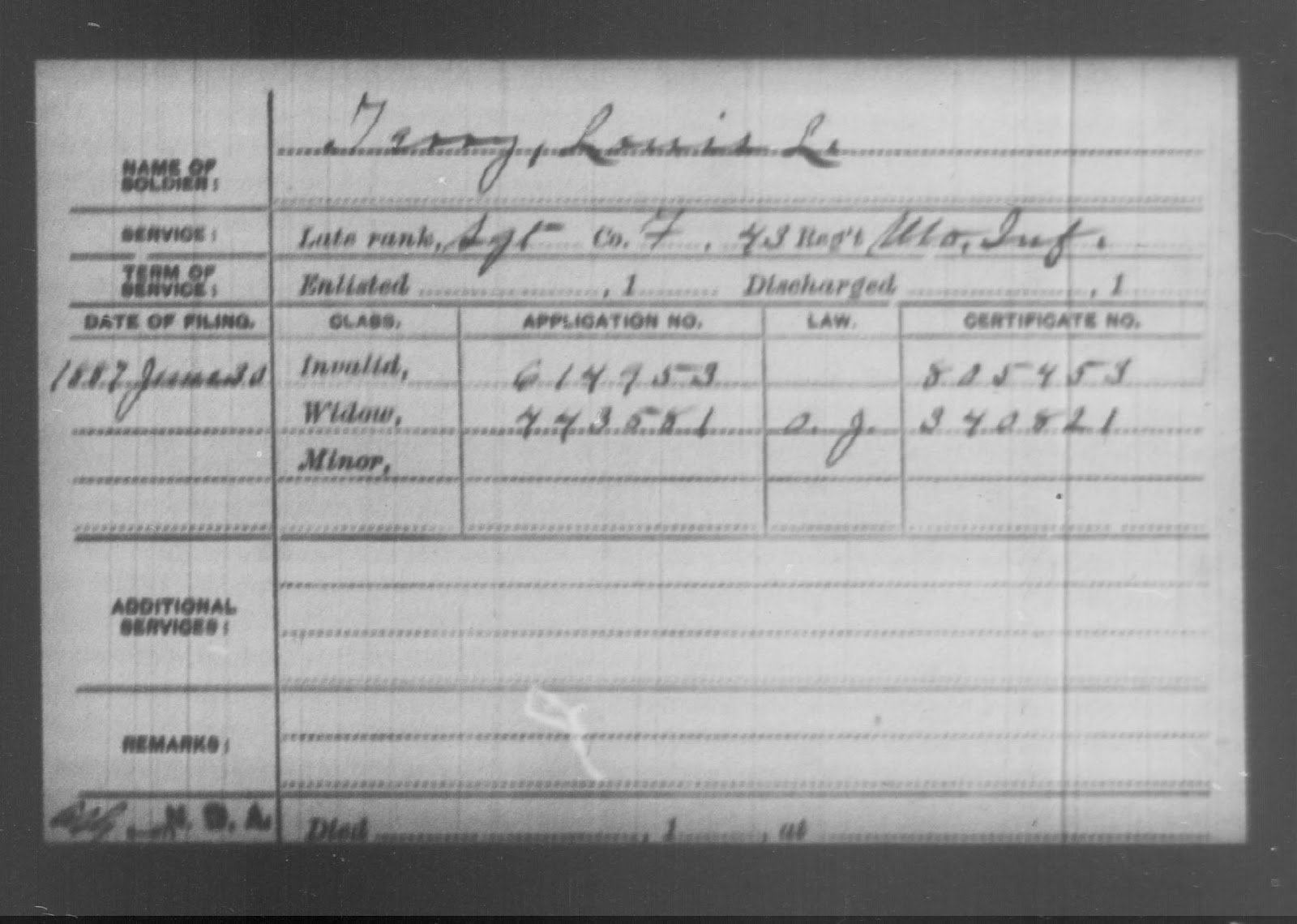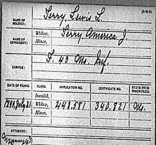 ABOVE: Lewis L. Terry, soldier, America J. Terry, widow. SOURCE: National Archives and Records Administration. Civil War Pension Index: General Index to Pension Files, 1861-1934 [database on-line]. Provo, UT, USA: Ancestry.com Operations Inc, 2000. Original data: General Index to Pension Files, 1861-1934. Washington, D.C.: National Archives and Records Administration. T288, 546 rolls. The image is found here at Ancestry.com.