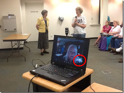 A member of your society hooks up his computer to the internet and a computer projector so attendees can see DearMYRTLE and with a webcam so DearMYRTLE can see your audience within your usual meeting place.