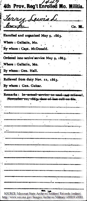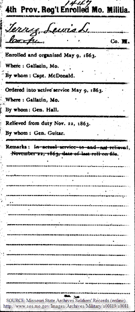 A SECOND ENTRY spotted by Pam also lists a Lewis L. Terry. This man is a corporal, Company M, 4th Regiment, Provisional Enrolled Missouri Militia. The image shown below is located here on the Missouri State Archives website in .pdf format. (From this you can see I added a more detailed caption with the URL.)